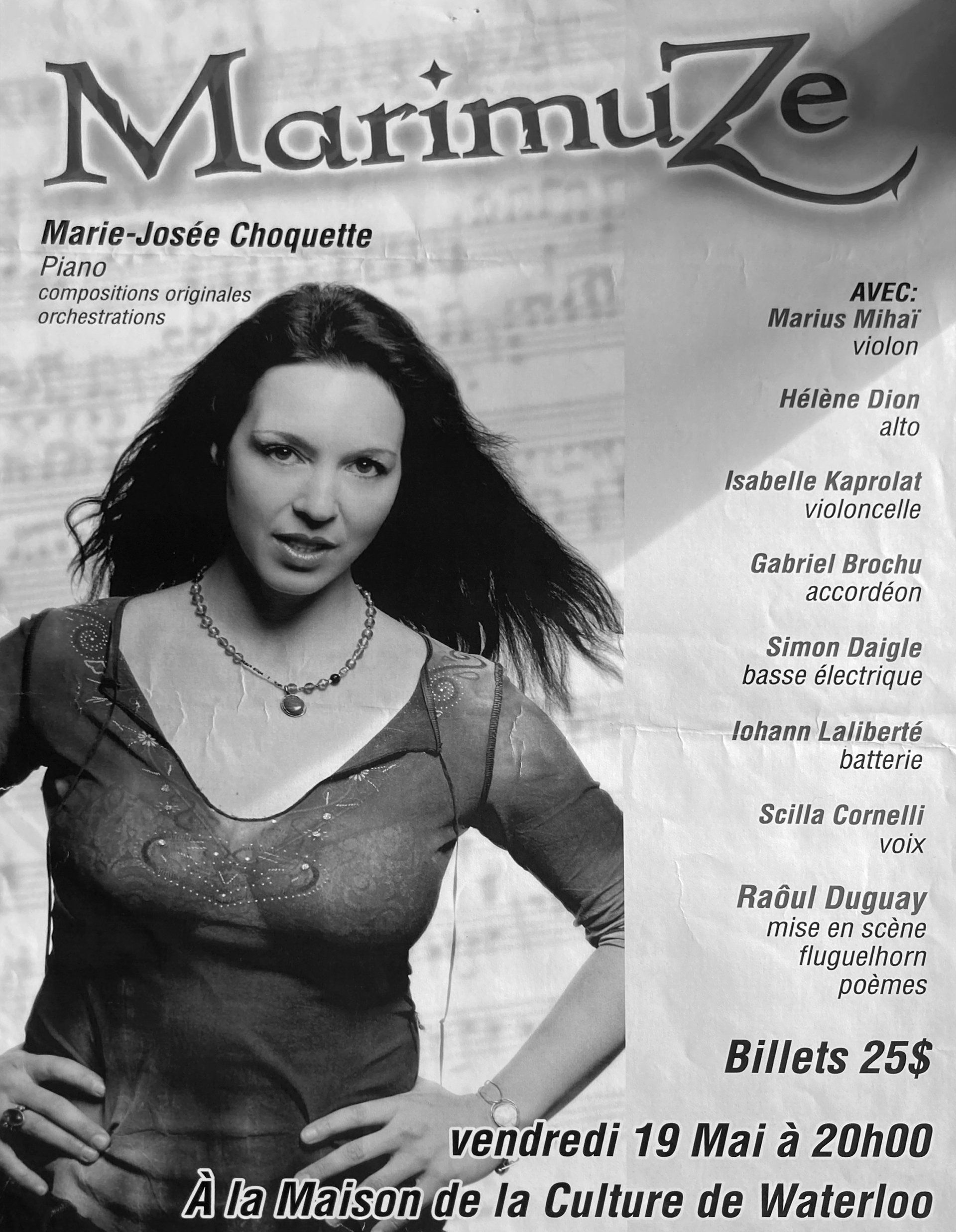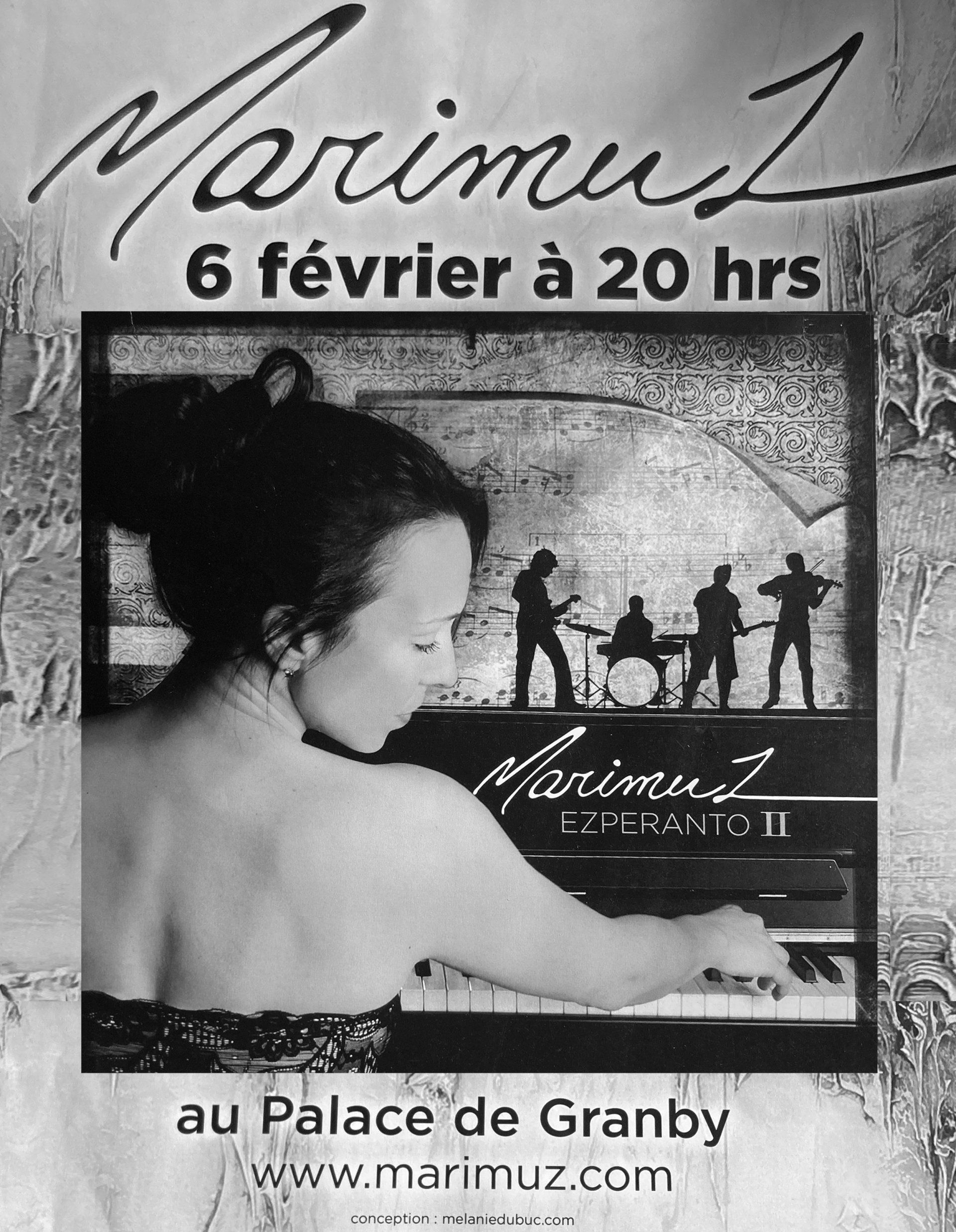 Marie-Josée Choquette, alias Marimuz, a offert plus d’une cinquantaine de concerts intimes et grand public. Tantôt accompagnée de musiciens sur la scène du Palace de Granby devant 700 personnes. Tantôt seule à son piano pour livrer des concerts intimes en extérieur ou en intérieur. Au fil des ans, Marie-Josée a ressenti autant de joie à proposer des spectacles multimédias à grand déploiement, mis en scène par Jessy Brown et Raoul Duguay, qu’à inviter divers publics à découvrir ses pièces en solo lors de riches rencontres culturelles.