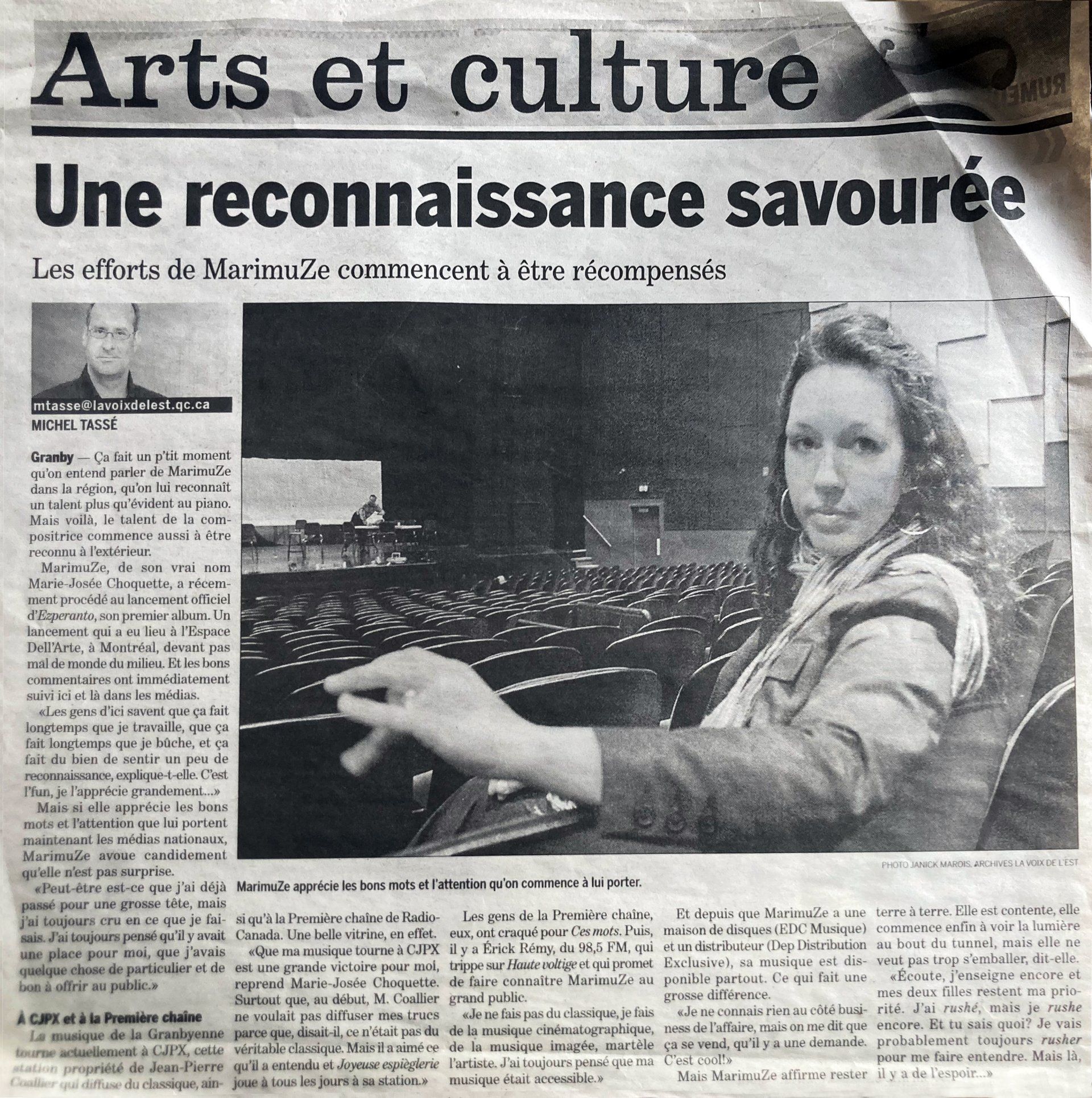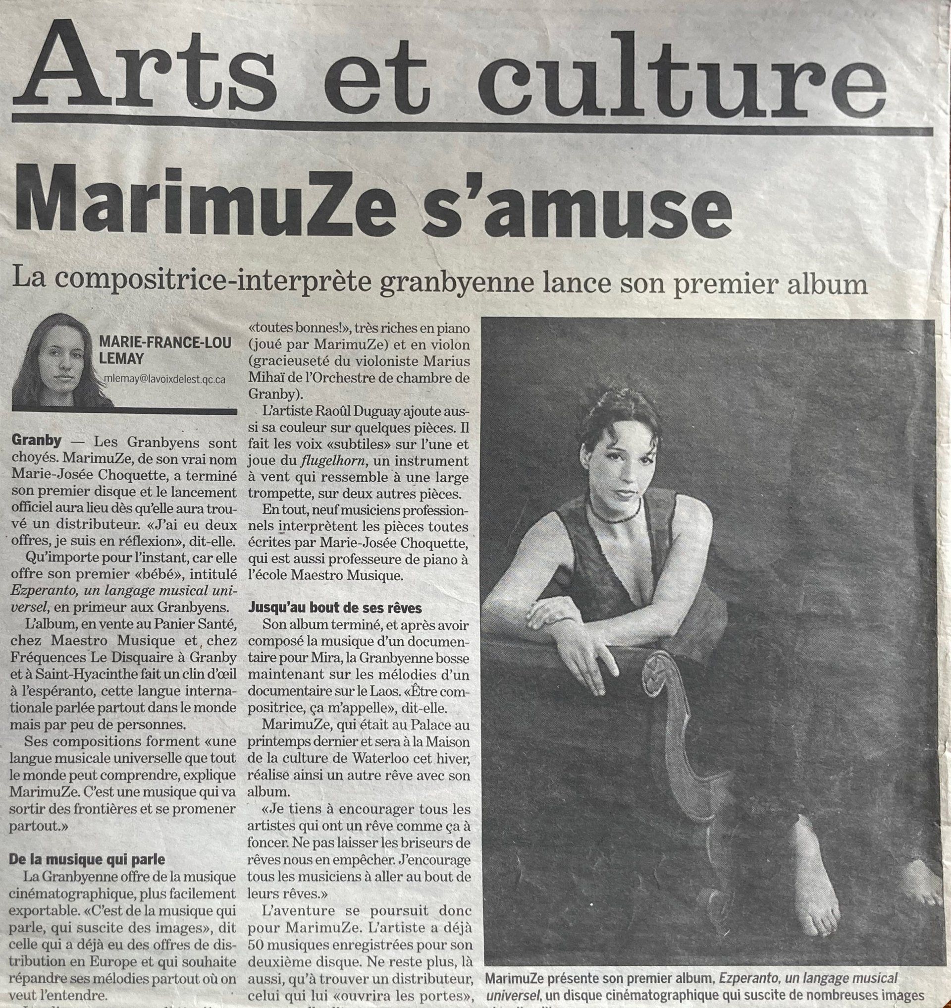 «Marimuz offre un spectacle d’une rare intensité. Dans une énergie de virtuosité et d’émotions fortes, cette artiste nous transporte dans un monde à la fois moderne et vibrant, au cœur d’un langage différent, celui que Marimuz a créé et qu’elle a appelé Ezperanto.» Benoit Gagné, Disques BG
